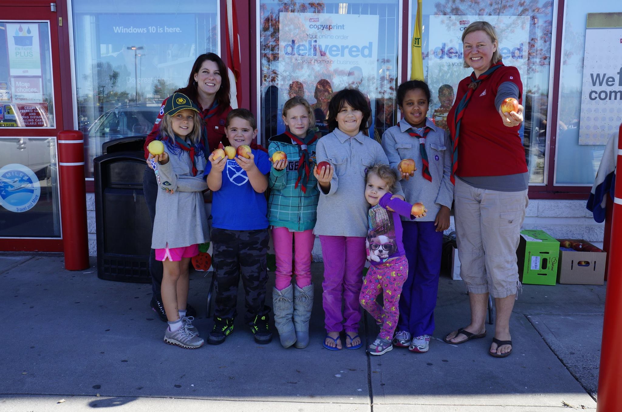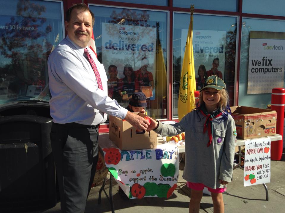 [Oct-3] The 1st Haney Beavers and Cubs were out in the community giving away apples by donation, raising funds for upcoming camps and other activities. We had a couple of visitors, including the Mayor of Pitt Meadows and Maple Ridge City Counsellor, Kiersten Duncan.